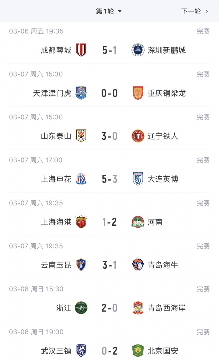 中超首轮赛果↓